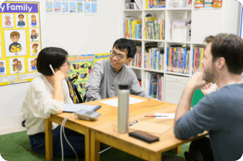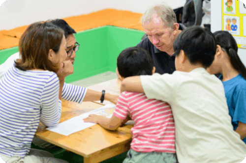 入口はまずリラックスした環境で。 まだグループレッスンに入る自信のない小さなお子様も、ご家族と一緒だと安心してレッスンができ、より自然な環境で英語に触れ合うことができます。お子様の成長を生で体感できるのもファミリーレッスンならでは。大人も学び直しができ英語力がUP!